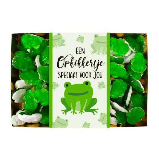 Stuur nu een lekkere snoep kikkertjes in een vrolijke brievenbusdoos en mooie wikkel met opdruk naar keuze.